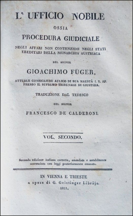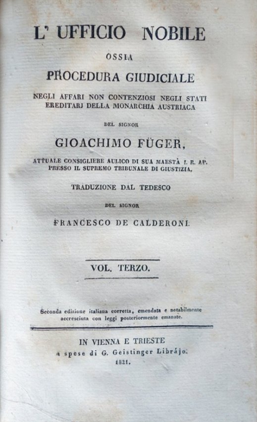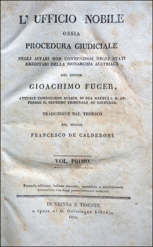 Fuger, Joachim. L'ufficio nobile ossia Procedura giudiciale negli affari non contenziosi negli stati ereditarj della monarchia austriaca del signor Gioachimo Füger [...]. Edizione seconda accresciuta e migliorata dall'Autore dietro il nuovo Codice Civile Universale. Traduzione dal tedesco del signor Francesco De Calderoni. Vol. Primo [-III]. In Venezia: nella Tipografia Picotti, a spese di G. Geistinger e Comp. di Trieste, 1821.