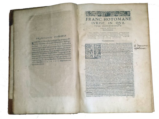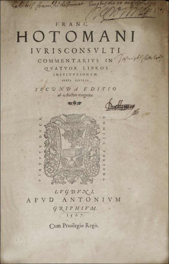 Hotman, François. Commentarius in quatuor libros Institutionum Iuris Civilis. Secunda editio. Lugduni (Lyon), Gryphius, 1567.