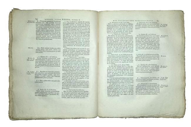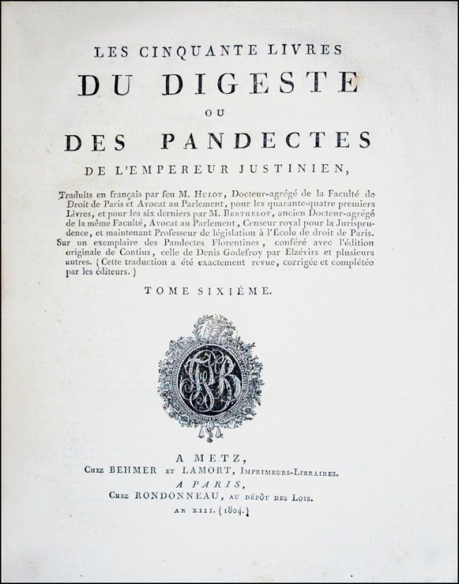 Hulot, Henry; Berthelot, Jean-François. Les Cinquante Livres du Digeste ou des Pandectes de l'Empereur Justinien. Metz, Behmer et Lamort, 1803-1804.