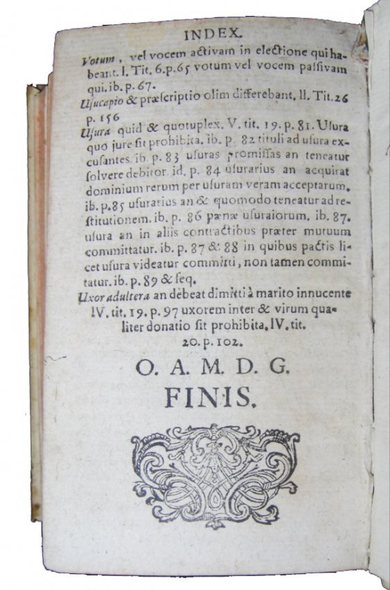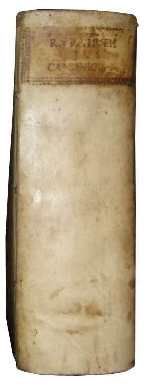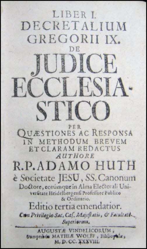 HUTH, ADAM. Ius Canonicum Ad Libros V. Decretalium Gregorii IX : Explicatum Et Per Quaestiones Ac Responsa In Methodum Brevem Et Claram Redactum. 5, ... De Delictis et Poenis Authore R. P. Adamo Huth e Societatum Jesu, Ss. Canonum Doctore, eormque in Alma Electorali Universitate Heidelbergensi Professore Publico et Ordinario. Augustae Vindelicorum, Sumptibus Mathiae Wollf, 1738 (Augsburg: Wollf, 1738).