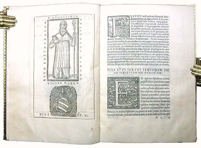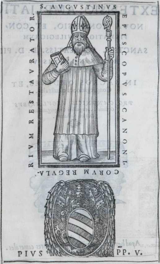At title-page, woodcut printer’s device with the Christus Salvator Mundi, full-page xylography at verso of title-page representing St. Augustin in episcopal dress and, by his feet, the arms of Pius V. Woodcut initials.