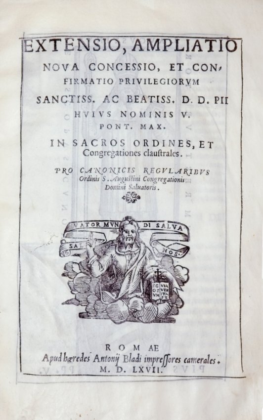 PIUS V (POPE). EXTENSIO, AMPLIATIO | NOVA CONCESSIO, ET CON- | FIRMATIO PRIVILEGIORVM | SANCTISS. AC BEATISS. D. D. PII | HVIVS NOMINIS V. | PONT. MAX. | IN SACROS ORDINES, ET | CONGREGATIONES CLAUSTRALES. | PRO CANONICIS REGVLARIBVS | ORDINIS S. AUGUSTINI CONGREGATIONIS | DOMINI SALUATORIS. | R O M AE | APUD HAEREDES ANTONIJ BLADI IMPRESSORES CAMERALES. | M. D. LXVII. [Rome, Heirs of Antonio Blado, Cameral Printers, 1567].