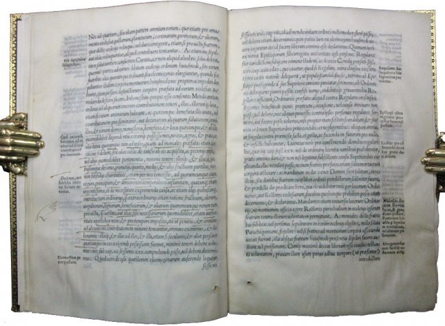 References: The copy quoted by Brunet (IV, 681): «Un exemplaire imprimé sur VÉLIN, accompagné de la confirmation desdits priviléges, par le cardinal Orsini, en manuscrit. 2 liv. 16 sh. Libri, en 1859». Graesse, V, 307: «Il ne existe un ex. tiré sur vélin (15 fr. Mac-Carthy. 2 l. 16 sh. Libri)». For the original manuscript of this work see in «Archivio Storico Capitolino» (Archivio Orsini, II.A.26,005).