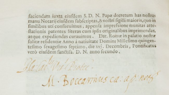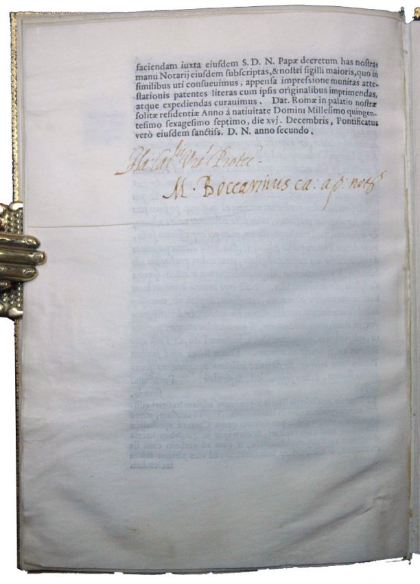 Provenance: Presumably the copy made for the Pope himself, as proven by the use of vellum as printing basis. At verso of the last leaf, official signature Fra: Car.lis Urs.s with countersignature of the notary M. Boccarinus ca: ap: not(aius): he should be Matteo Boccarini from Amelia (near Terni), very close to the Orsini family. Boccarini himself was the notary that wrote the wedding contracts between Federico Sforza of St. Fiora and Beatrice Orsini, to whom Flavio Orsini let a dowry of 22000 scutes (Archivio Orsini, in «Archivio Storico Capitolino», II.A.26,003).