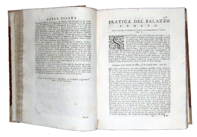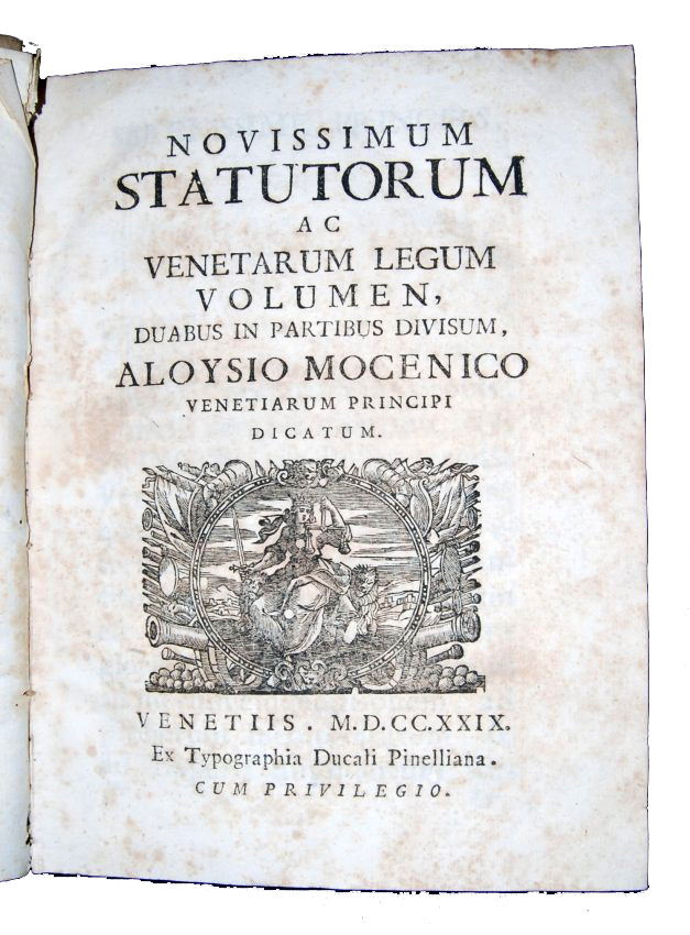 [1.]: Novissimum statutorum ac Venetarum legum volumen, duabus in partibus divisum, Aloysio Mocenigo Venetiarum principi dicatum. Venetiis: ex typographia ducali Pinelliana, 1729.