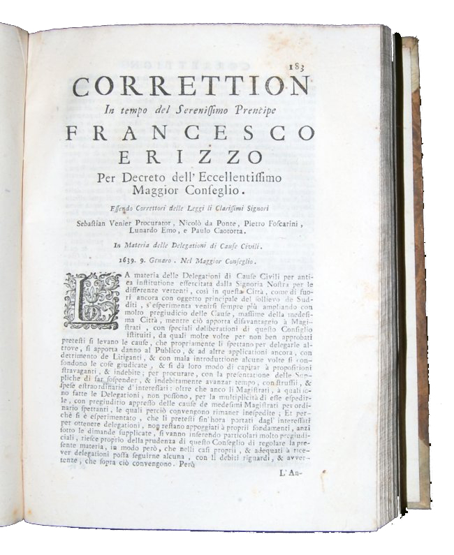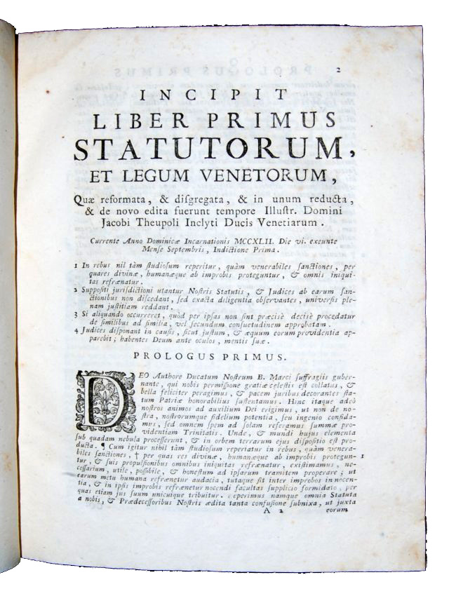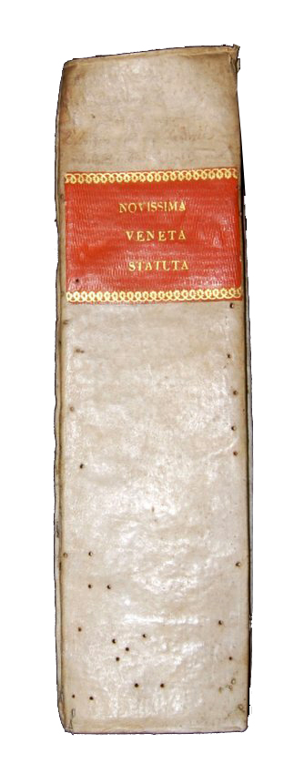 Important collection of Venetian statutes comprising the first five books of the Doge Giacomo Tiepolo and the sixth of the Doge Andrea Dandolo, the statutes of the judges of the petition formed the year 1244, the ancient laws under the title of Consulta, the Law Pisana issued on 1492, the practice of the Palace of Venice, the corrections of the Doges Barbarigo Loredan, Grimani, Gritti, Trevisan, Cicogna, Memo, Bembo, Priuli, Francesco Contarini, Erizzo, Carlo Contarini, Domenico Contarini and Alvise Contarini.