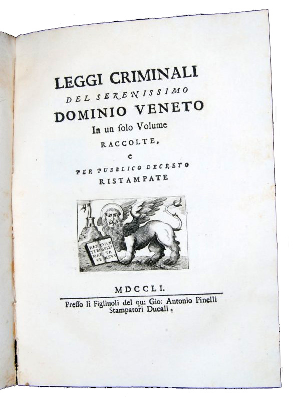 [2.]: Leggi criminali del serenissimo dominio Veneto in un solo volume raccolte, e per pubblico decreto ristampate. [Venezia]: Presso li figliuoli del qu: Gio: Antonio Pinelli Stampatori Ducali, 1751.