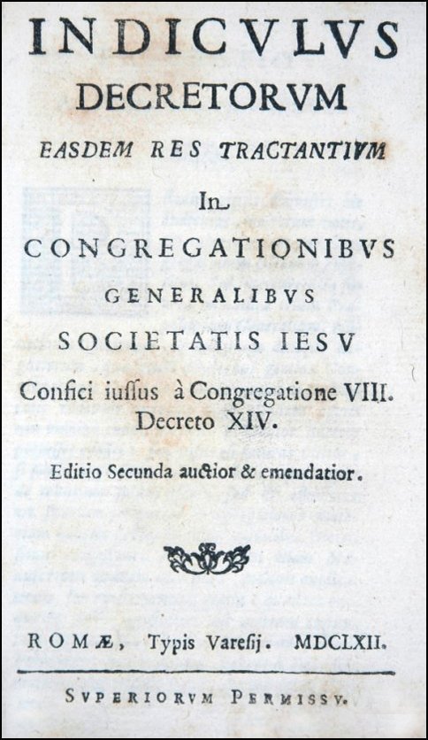 1. Indiculus decretorum easdem res tractantium In Congregationibus Generalibus Societatis Iesu Confici iussus a Congregatione VIII. Decreto XIV. Editio Secunda auctior & emendatior. Romae, Typis Varesij, 1662.