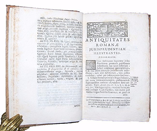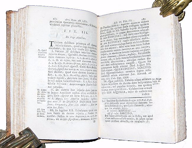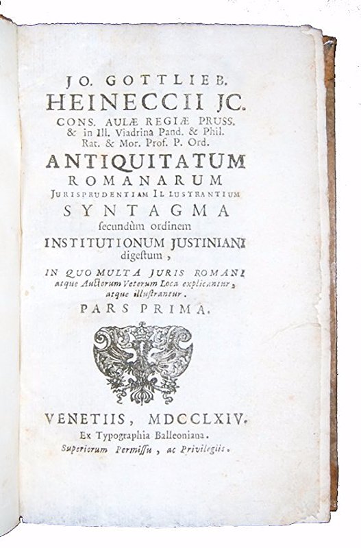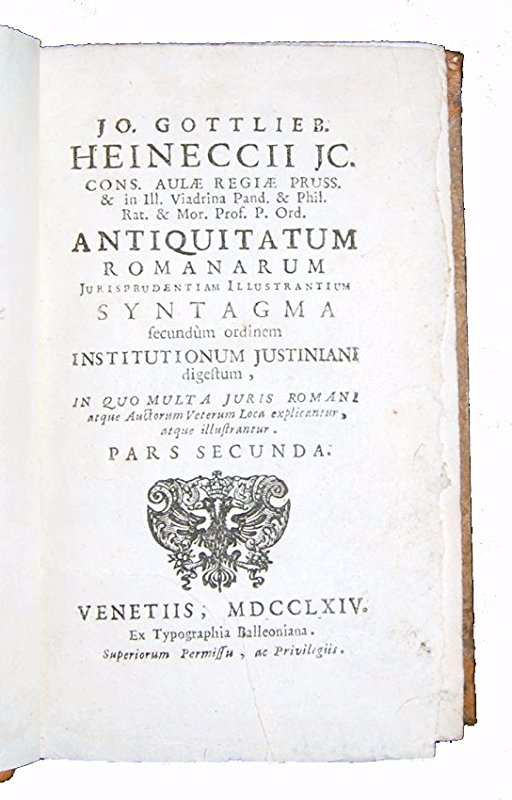 Heinecke, Johann Gottlieb. Jo. Gottlieb. Heineccii [...] Antiquitatum Romanarum jurisprudentiam illustrantium Syntagma secundum ordinem Institutionum Justiniani digestum, in quo multa juris Romani atque auctorum veterum loca explicantur, atque illustrantur. Pars prima [-secunda]. Venetiis: ex Typographia Balleoniana, 1764.