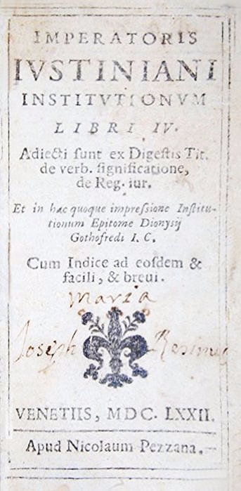 Iustinianus Augustus. Imperatoris Iustiniani Institutionum libri 4. Adiecti sunt ex digestis tituli de verborum significatione et de regulis iuris. Et in hac quoque impressione Institutionum Epitome Dionysij Gothofredi I.C. Cum indice ad eosdem & facili, & breui. Venetiis: apud Nicolaum Pezzana, 1672.