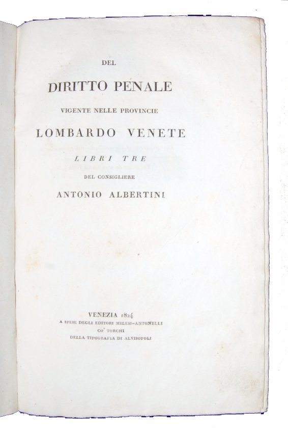 Albertini, Antonio Costantino. Del diritto penale vigente nelle provincie lombardo venete. Libri tre del consigliere Antonio Albertini. Venezia: a spese degli editori Milesi-Antonelli co' torchi della tipografia di Alvisopoli, 1824.