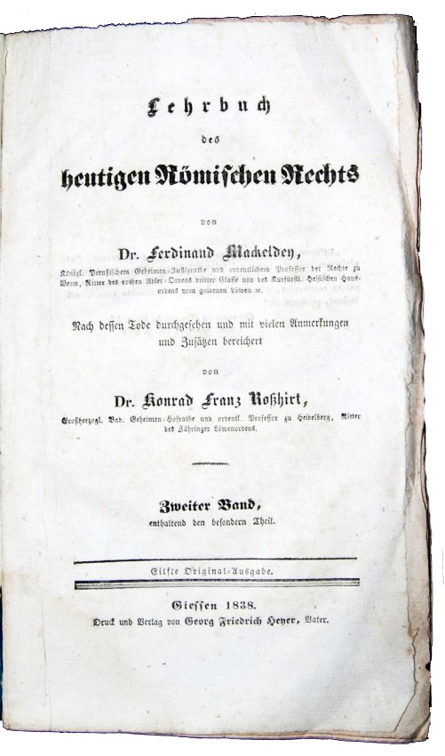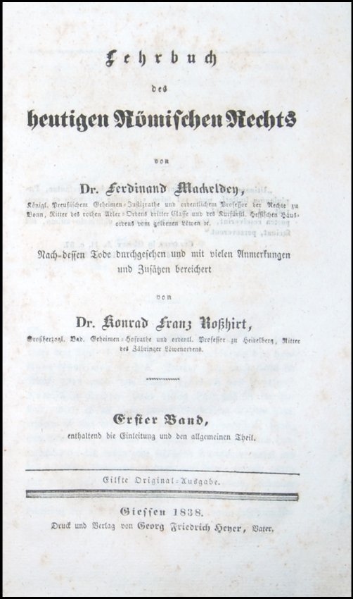 Mackeldey, Ferdinand. Lehrbuch des heutigen Romischen Rechts von Dr. Ferdinand Mackeldey, [...] von Dr. Konrad Franz Rokhirt, [...]. Erster- [Zweiter-] Band. Giessen: Druck und Verlag von Georg Friedrich Heyer, 1838.