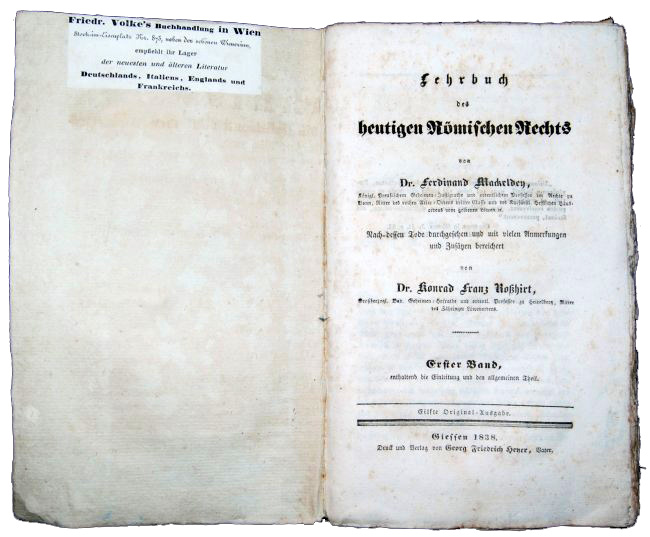 Ferdinand Mackeldey (1784-1834), Professor of Law at the University of Bonn, became famous for this textbook, which was first published in 1814, the most popular text on Roman Law in the first half of the 19th century. Its clarity and vividness ensured for a Europe-wide distribution, almost in all languages.