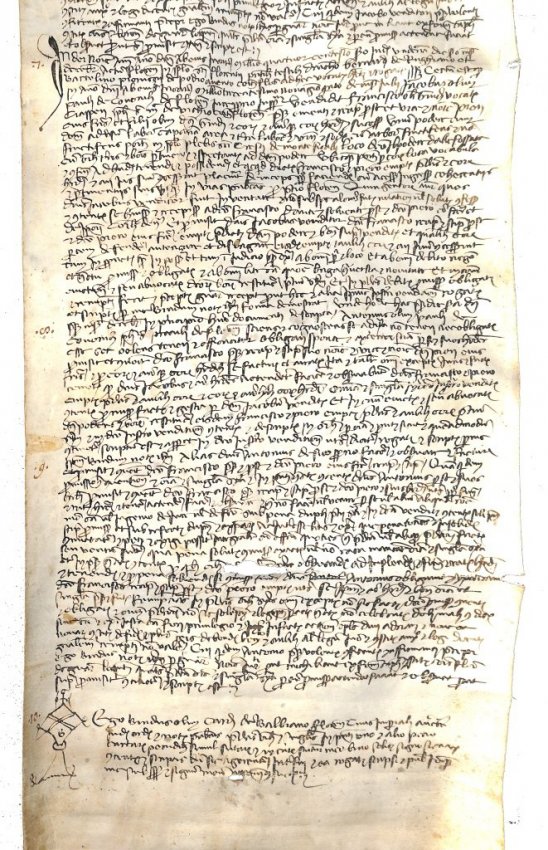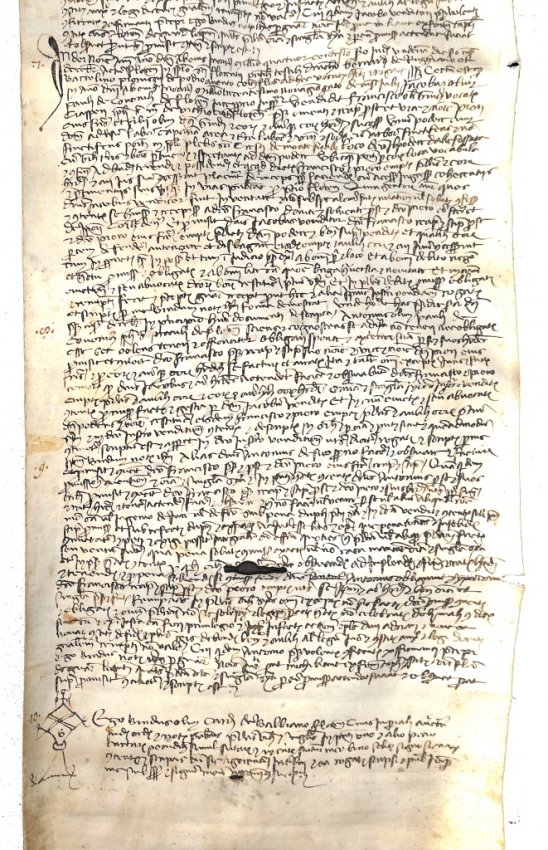 This ponderous and early document regards the sale of a farm in the area of Colognole (near Florence, in the area of Chianti) from Jacopo de Covonibus to Francesco called Ciappon. Both De Covonibus family was an important Florentine family since Middle Ages; the Ciapponi surname still survives.