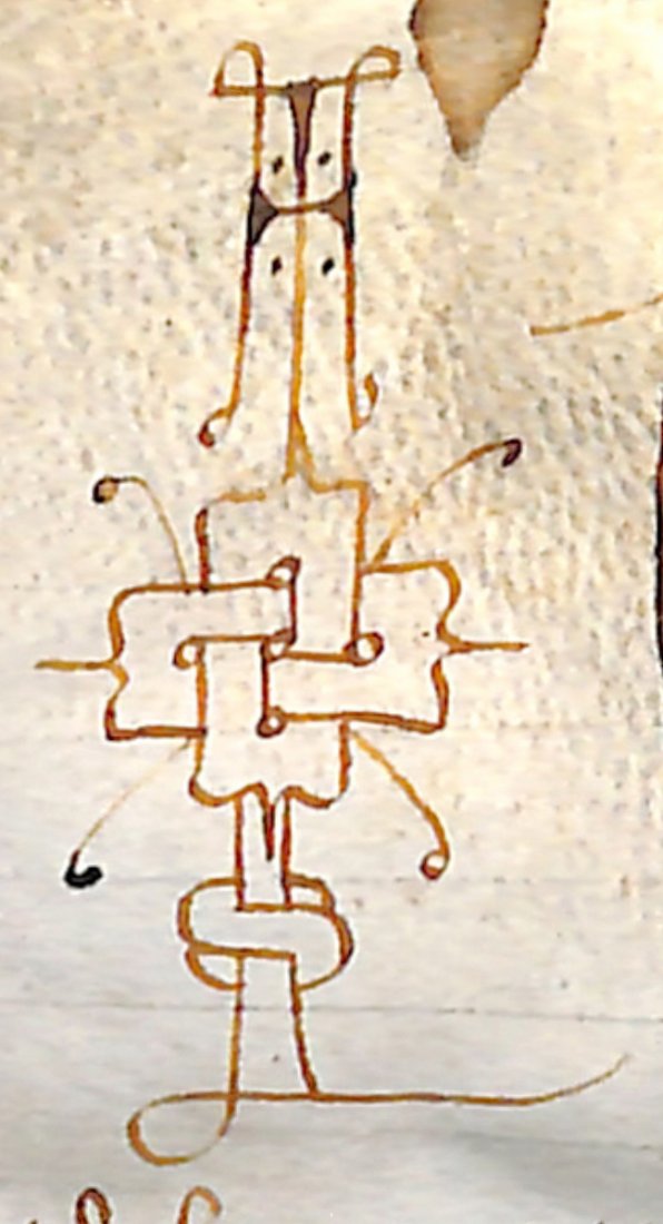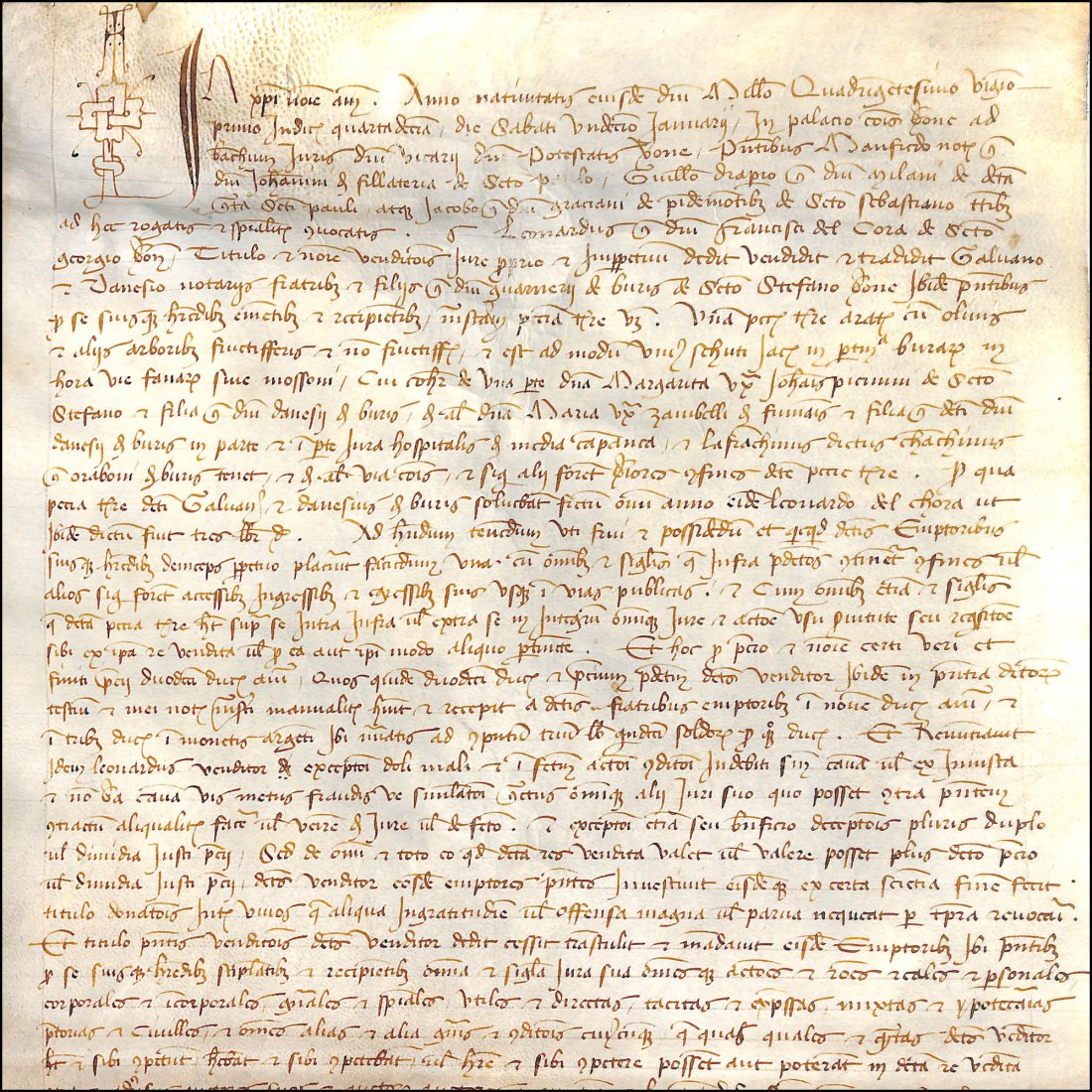7-lines capital I drawn in pen at the beginning of the document. At the upper left corner of the page, the signum tabellionis of the notary Bartolomeo Maticiani.