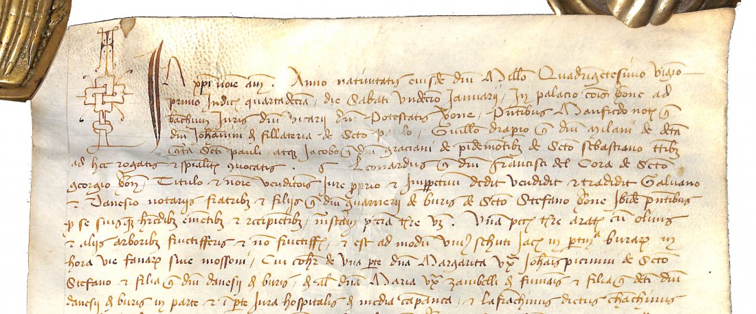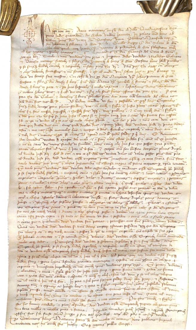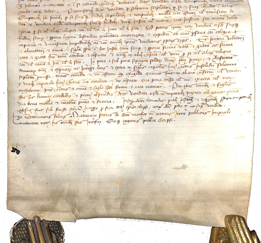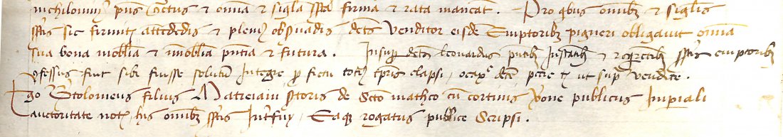 The seller is Leonardo del Cora, from the contrada (a city quarter) of San Giorgio, and the buyers are the two brothers (both notaries) Galvano and Danesio de Buri from the contrada of Santo Stefano. The land was paid 200 Ducats.