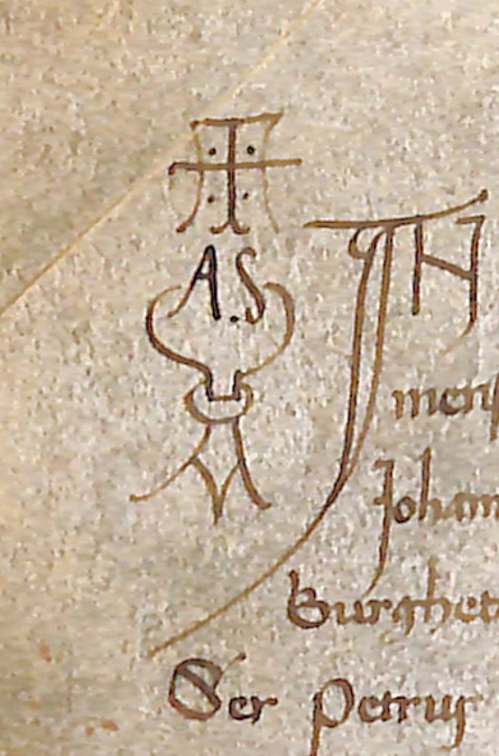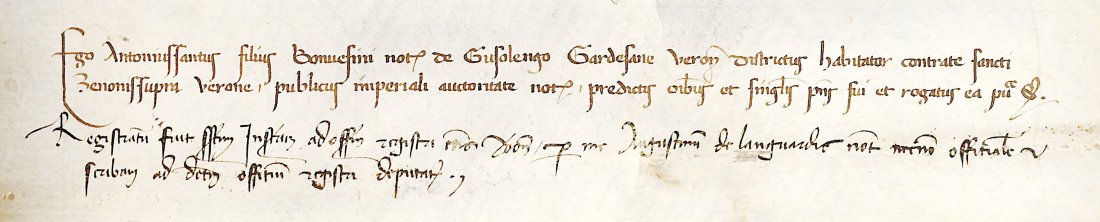 5-lines capital I drawn in pen at the beginning of the document. At the upper left corner of the page, the signum tabellionis of the notary Antonius Santus Bonvicini from Gusolengo Gardesane (now Bussolengo, near Garda Lake).