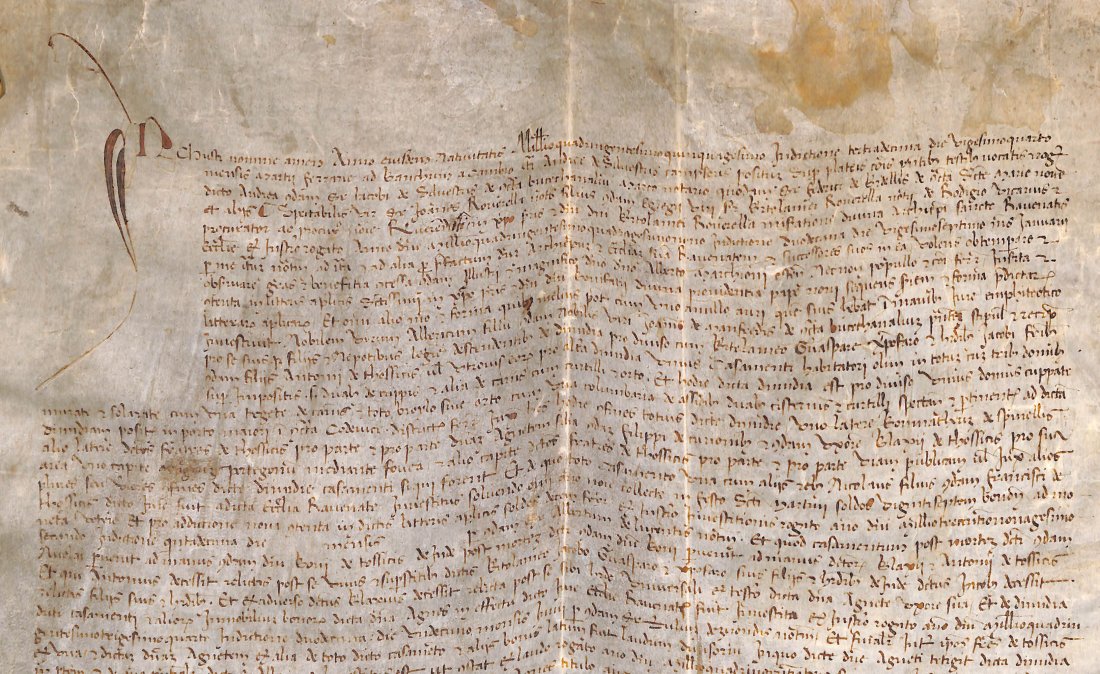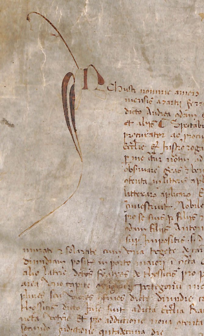 14-lines capital I drawn in pen at the beginning of the document. At the bottom of the page, three signa tabellionis near the signatures.