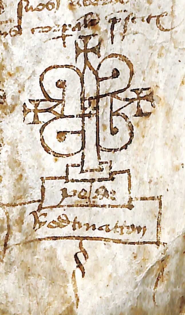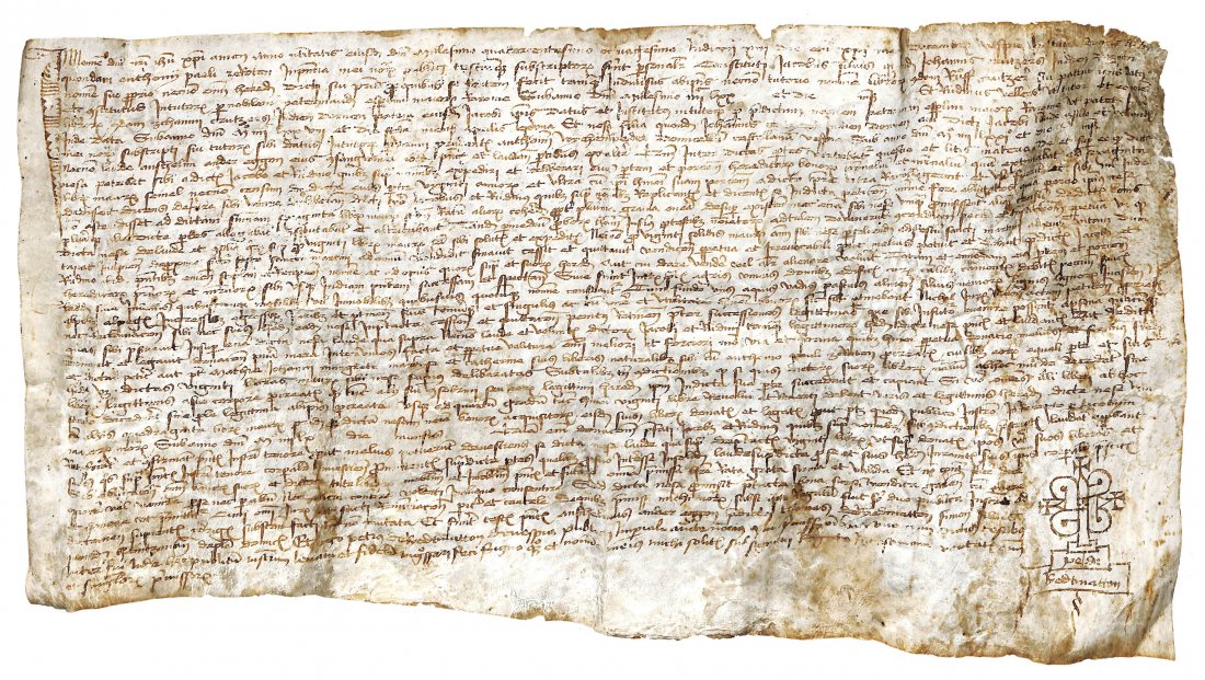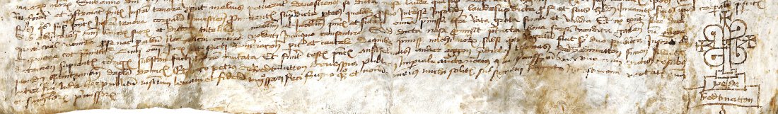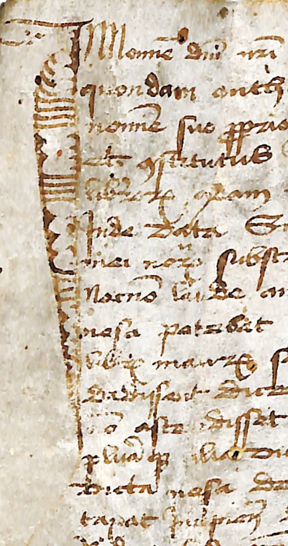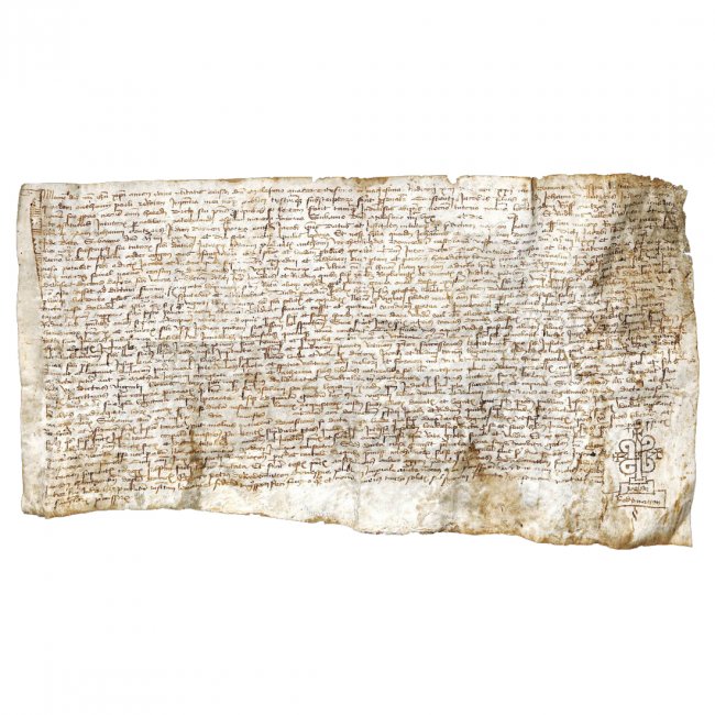 Single leaf of parchment (377x185-210 mm), 37 lines of text in 15th century cursive writing. 12-lines pens marginal extension to the first letter of the text. Signum tabellionis of the notary based on the pattern of the cross at the end of the leaf.