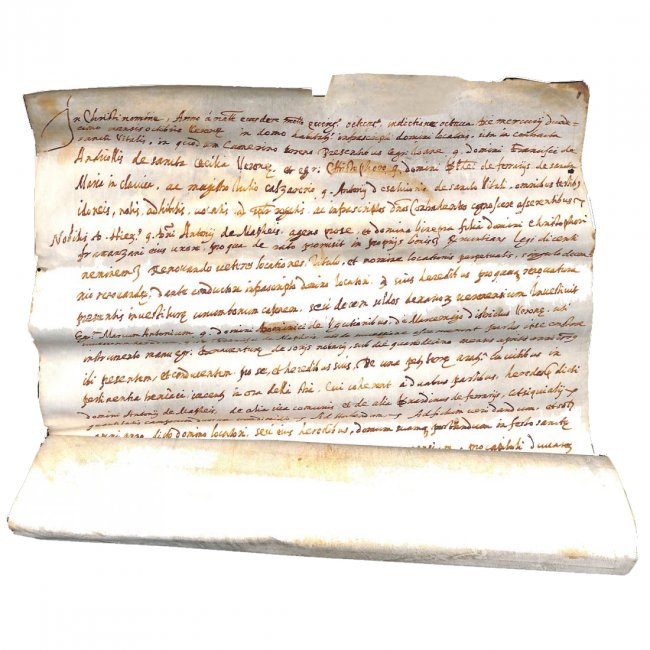A scroll of parchment (46x24 cm), written by a 16th century cursive writing in sepia ink. Text in Latin.