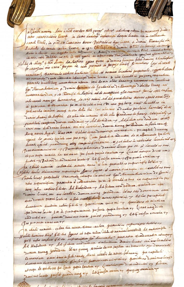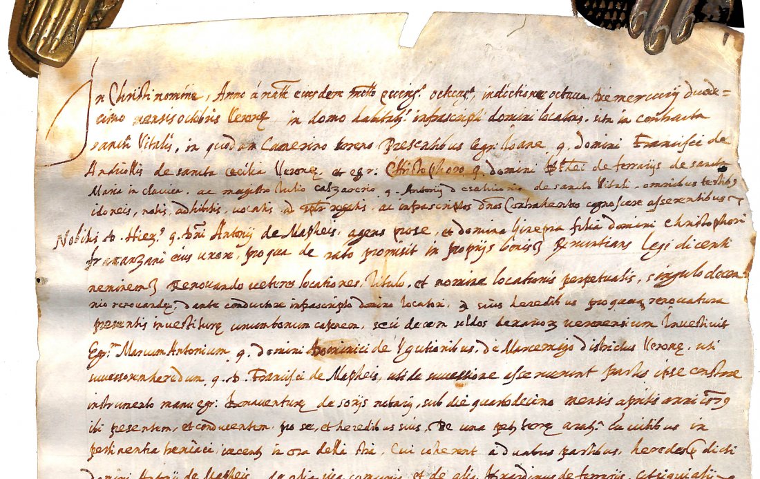 A lease contract in which the lessee Antonio Maffei and his wife Ginepra Fracanzani rent to Domenico de Uguccioni from Marceniga a land to cultivate near the Garda Lake. The contract is renewable every ten years.