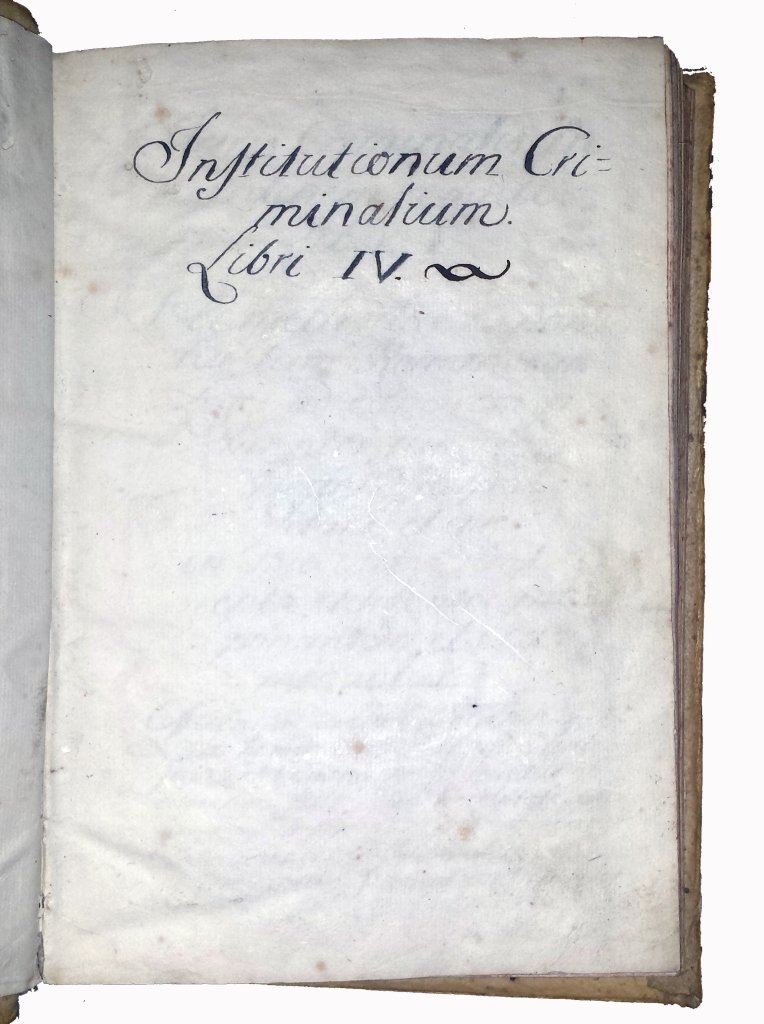 [Caravita, Tommaso]. Institutionum Criminalium Libri IV. [at p. 1:] Ubi methodice exponuntur, tum Romanorum Leges ad eam rem pertinentes, tum Leges Regni Neapolitani [...]. (presumably Naples:), End of 17th century-beginning of 18th century.