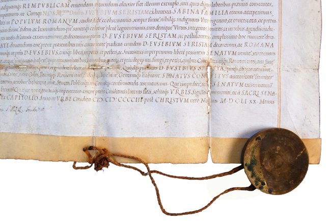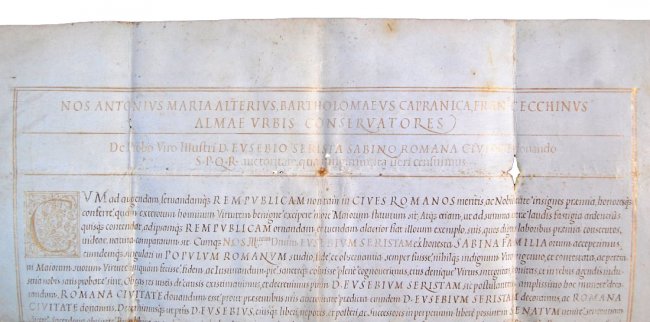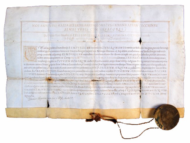 Nos Antonius Maria Alterius Bartholomaeus Capranica, Fran. Cecchinus Almae Urbis Conservatores De Probo Viri Illustri D. Eusebio Serista Sabino Romana Civitate Donando S.P.Q.R. auctoritate qua fungimur ita fieri censuimus […]. Ex Capitolio, Anno at Urbe Condita 2403, post Christum vero natum 1651, 20 Mensis Novembris.