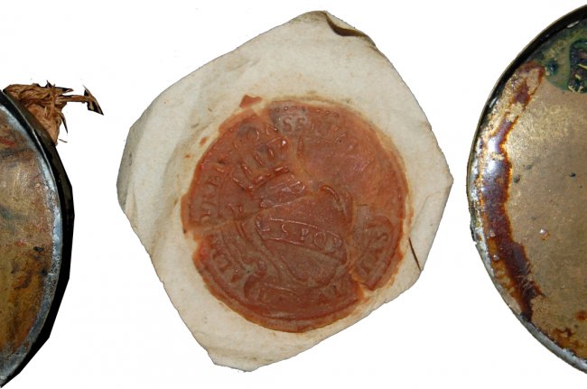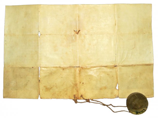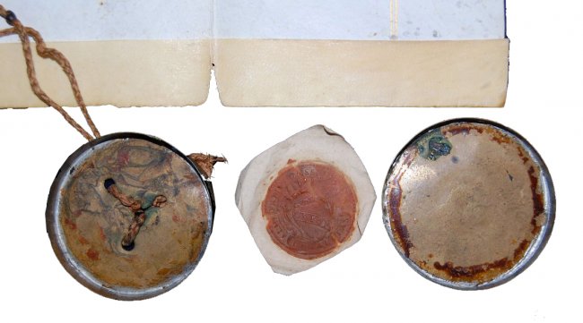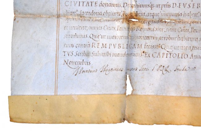 Original folded vellum; wax seal of Roman Capitolium (S.P.Q.R.) on paper, stored in a round metal container tied with original rope at the bottom of the parchment.