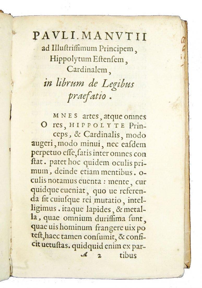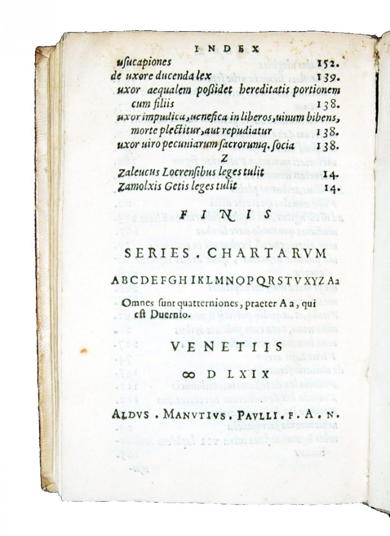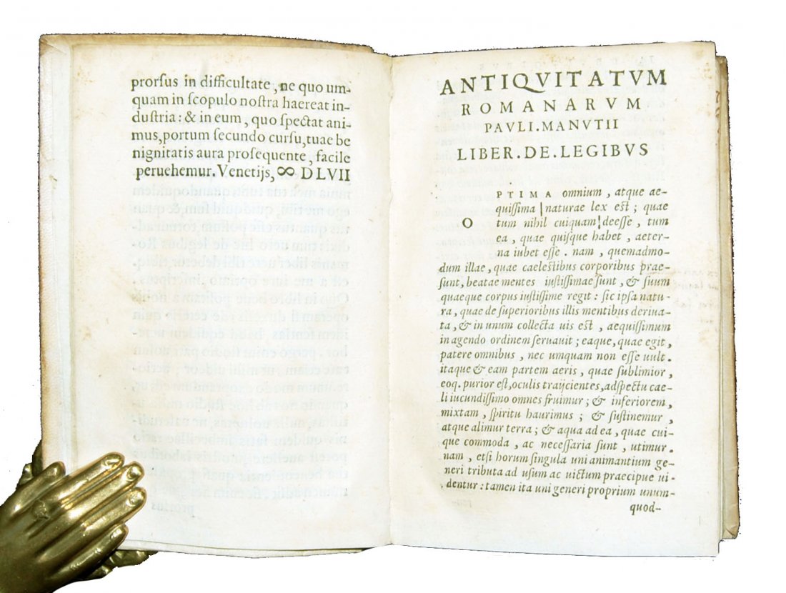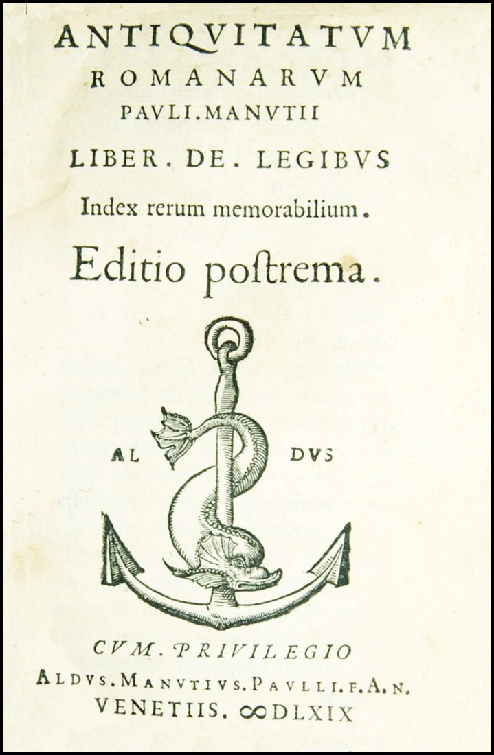 Manuzio, Paolo. Antiquitatum Romanarum Pauli. Manutii liber. de. legibus index rerum memorabilium. Editio postrema. Venetijs [Venezia]: Aldus. Manutius. Paulli. f.A.n., 1569 (Venetiis : Aldus. Manutius. Paulli. f.A.n., 1569).