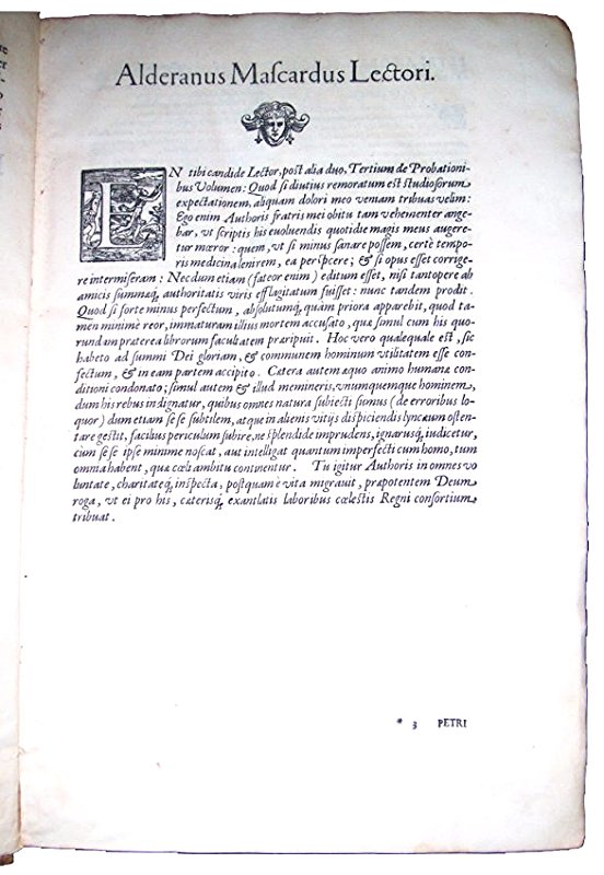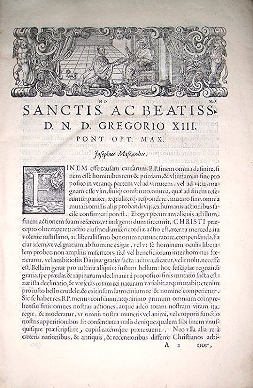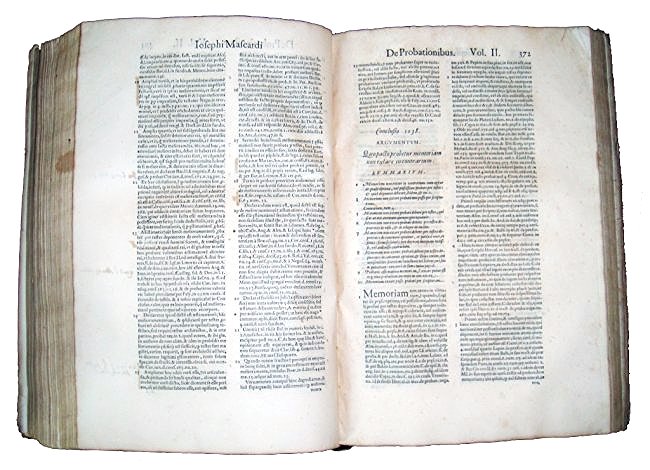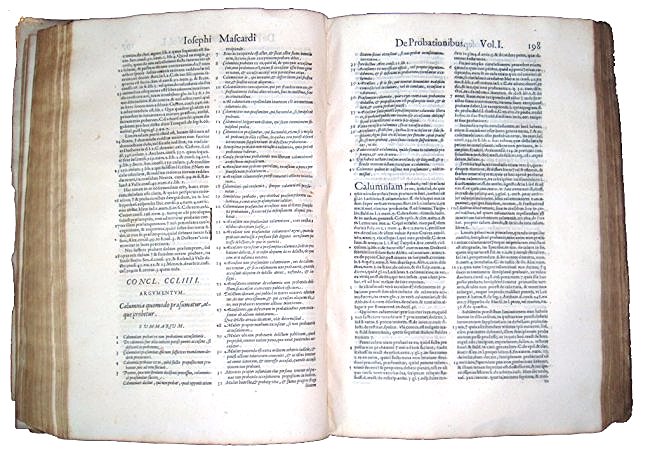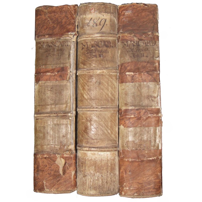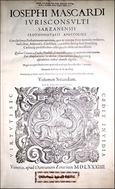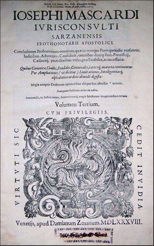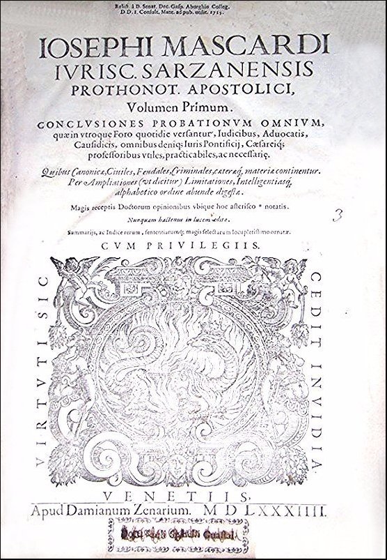 Mascardi, Giuseppe. Iosephi Mascardi ... Volumen primum (secundum et tertium). Conclusiones probationum omnium, quae in vtroque foro quotidie versantur, iudicibus, aduocatis, causidicis ... vtiles, praticabiles, ac necessariae. Quibus canonicae, ciuiles, feudales, criminales, caeteraeque, materiae continentur. Per ampliationes (ut dicitur) limitationes, intelligentiasque alphabetico ordine abunde digestae. Numquam hactenus in lucem aeditae. Summarijs, ac indice rerum, sententiarumque magis selectarum locupletissimo ornataeVenetiis: Apud Damianum Zenarum, 1584-1587.
