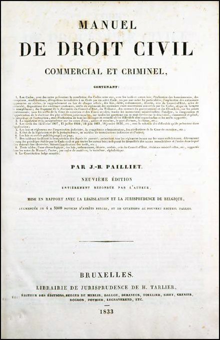 Pailliet, Jean Baptiste Joseph. Manuel de droit civil commercial et criminal, mise en rapport avec la legislation et la jurisprudence de Belgique . Bruxelles, Librairie de Jurisprudence di H.Tarlier, 1833.