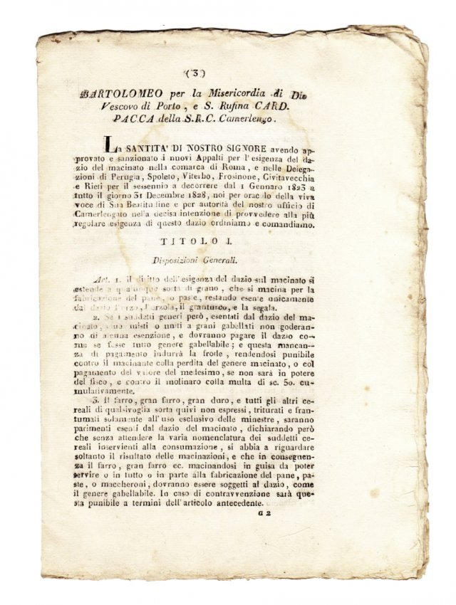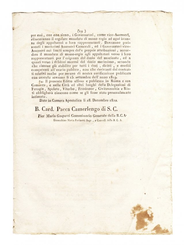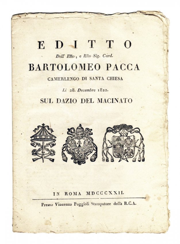 [1.]: Apostolic Chamber - cardinal Pacca (Camerlengo). Editto dell'Emo, e Rmo Sig. Card. Bartolomeo Pacca camerlengo di Santa Chiesa, lì 28.Decembre 1822., sul dazio del macinato. Roma: presso Vincenzo Poggioli stampatore della R.C.A., 1822.