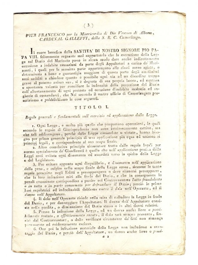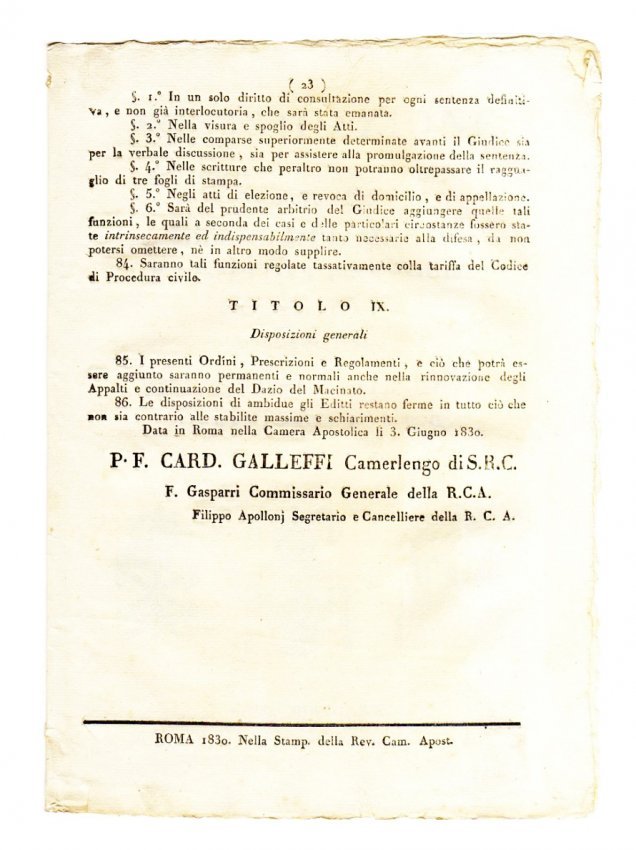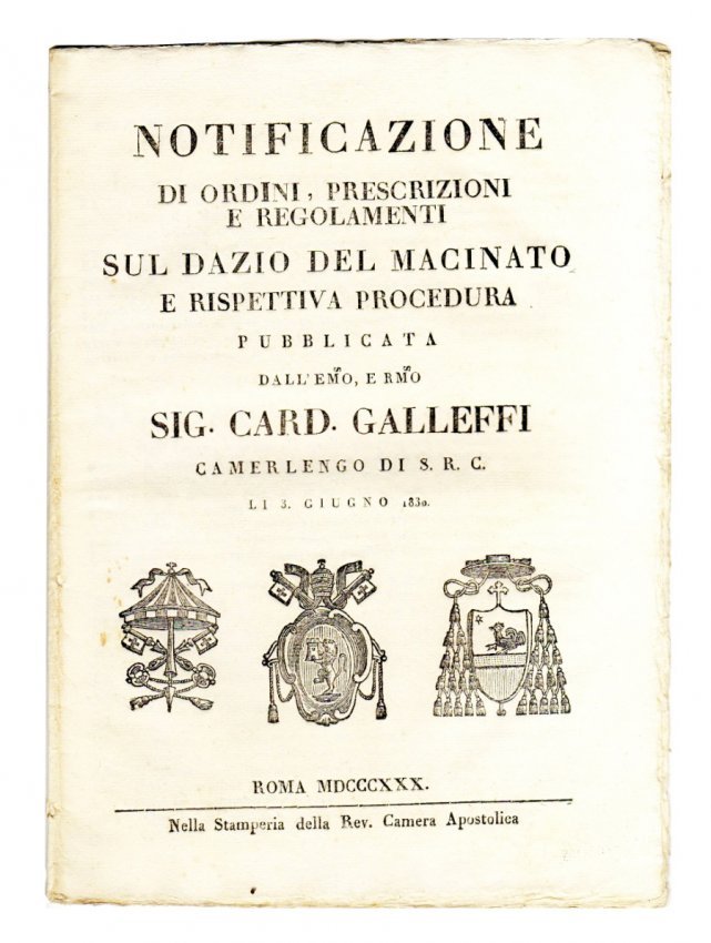 [2.]: Apostolic Chamber - cardinal Galleffi (Camerlengo). Notificazione di ordini, prescrizioni e regolamenti sul dazio del macinato e rispettiva procedura pubblicata dall'Emo, e Rmo sig. Card. Galleffi camerlengo [...]. Roma: nella stamperia della rev. camera apostolica, 1830.