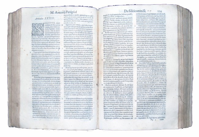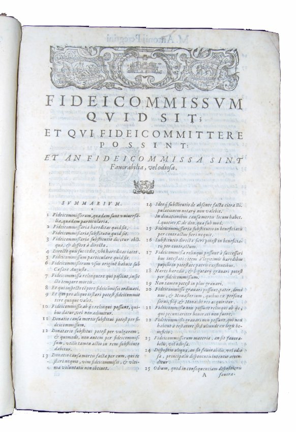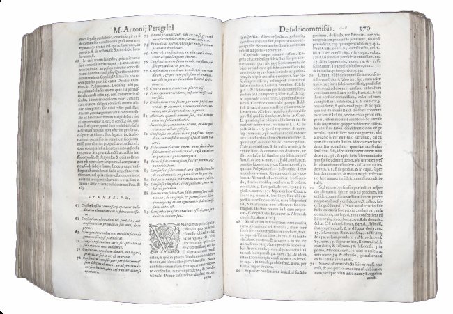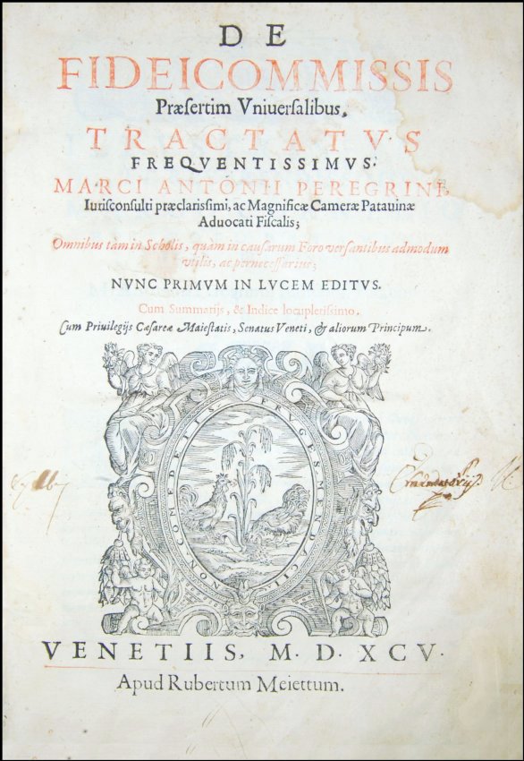 Pellegrini, Marco Antonio. De fideicommissis praesertim vniuersalibus, tractatus frequentissimus: Marci Antonii Peregrini, iurisconsulti praeclarissimi, [...]. Nunc primum in lucem editus.Cum summarijs, & indice locupletissimo. Venetiis: apud Rubertum Meiettum, 1595.