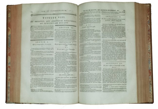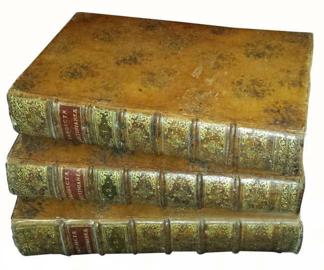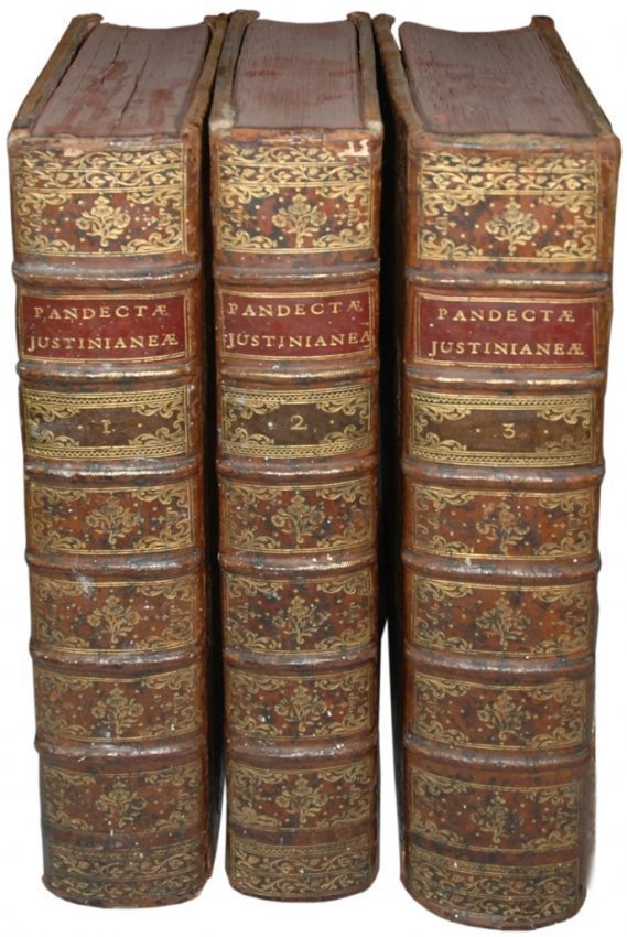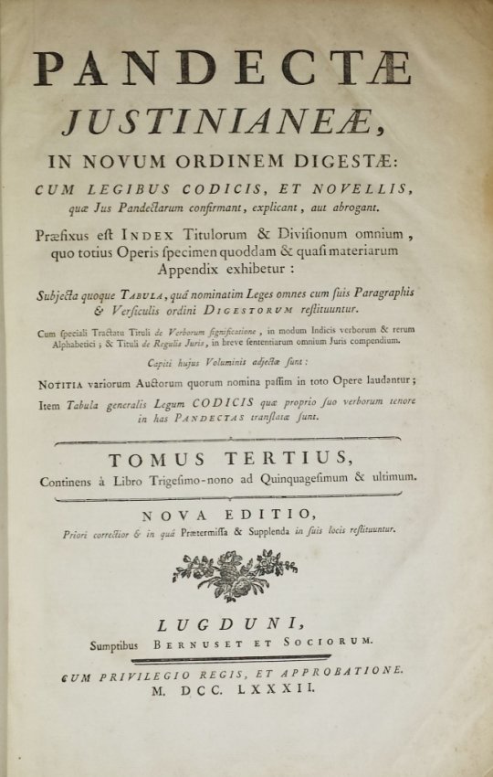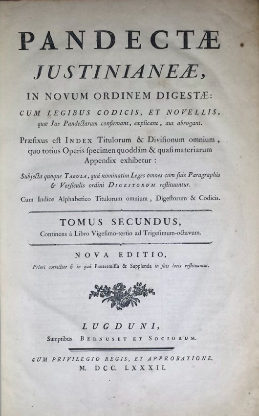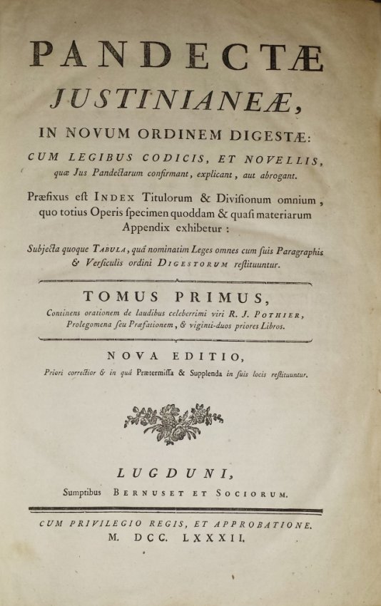 (Pothier, Robert-Joseph). Pandectae Justinianeae, in Novum Ordinem digestae: cum legibus, codicis et novellis, quae jus pandectarum confirmant, explicant, aut abrogant [...] Continens Orationem de laudibus celeberrimi viri R. J. Pothier [...] Nova editio, priori correctior et in qua pratermissa & supplenda in suis locis restituuntur . Lugduni, Sumptibus Bernuset et Sociorum, 1782.