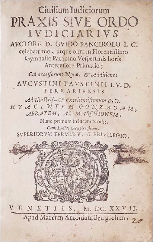 Panciroli, Guido. Ciuilium iudiciorum praxis sive ordo ivdiciarivs avctore d. Gvido Pancirolo ... Cui accesserunt notae, & additiones Avgvstini FavstiniiVenetiis, apud Marcum Antonium Brugiolum, 1627.