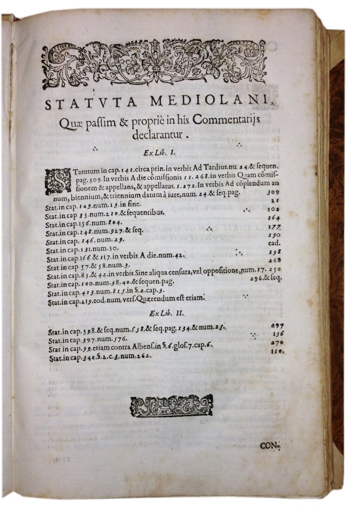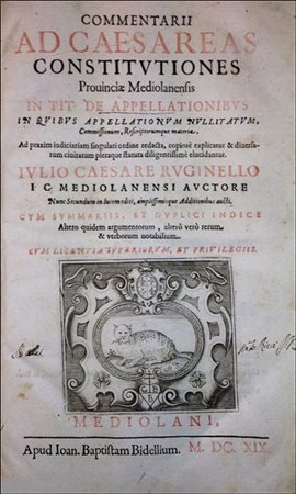 Ruginelli, Giulio Cesare. Commentarii ad caesareas constitutiones prouinciæ Mediolanensis in tit. de appellationibus : in quibus appellationum nullitatum, commissionum rescriptorumque materia ad praxim iudiciariam singulari ordine redacta copiosè explicatur. Iulio Caesare Ruginello i.c. Mediolanensi auctore ... ; cum summariis et duplici indice altero quidem argumentorum alterò verò rerum & verborum notabilium. Mediolani (Milano), apud Ioan. Baptistam Bidellium, 1619.