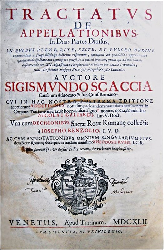 Scaccia, Sigismondo.Tractatus de appellationibus : in duas partes diuisus : in quibus plene, rite, recte et pulcro ordine examinatum, frugi solidaq[ue] doctrina resolutum quicquid ad praedictas appellationes quoquomodo spectare aut contingere potest [...]. Venetiis (Venice): Turrini. 1642.