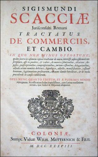 Scaccia, Sigismundus. Tractatus de commerciis, et cambio. In quo non minus opportune, quam iuxa occasionem copiose tractatur de mora, interesse, usura, solemnitate scripturae, asse in pondere, & valore, de moneta solutionibus, oblatione, deposito [...] Opus nunc quarto editum, et a plurimis mendis repurgatum. Accessit etiam index copiosissimo. Coloniae, sumpt. viduae Wilh. Metternich & filii, 1738.
