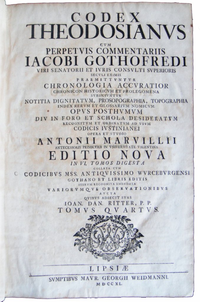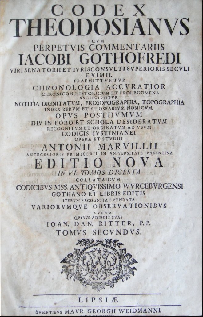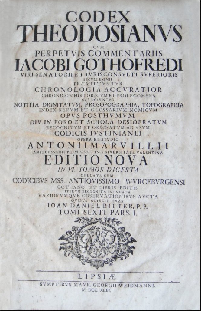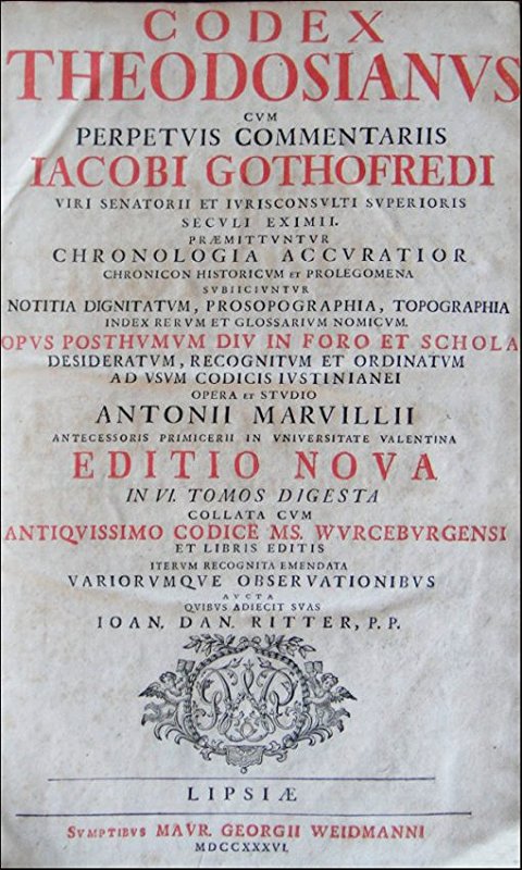 Theodosius Emperor-Godefroy, Jacques (editor). Codex Theodosianus: cum perpetuis commentariis Iacobi Gothofredi viri senatorii et iurisconsulti superioris seculi eximii : præmittuntur chronologia accuratior chronicon historicum et prolegomena subiiciuntur notitia dignitatum, prosopographia. Editio noua in VI tomos digesta collata cum antiquissimo codice ms. Wurceburgensi ... recognita emendata variorumque obseruationibus aucta quibus adiecit suas Joan. Dan. Ritter. Leipzig: Weidmann, Moritz Georg. 1736-1743.
