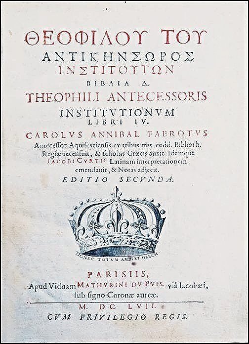 Theophilus Antecessor (Fabrot, Charles Annibal -translator). Theophili Antecessoris Institutionum libri IV. Parisiis, Apud Viduam Mathurini Du Puis, via Iacobaea, sub signo Coronae aureae, 1657.