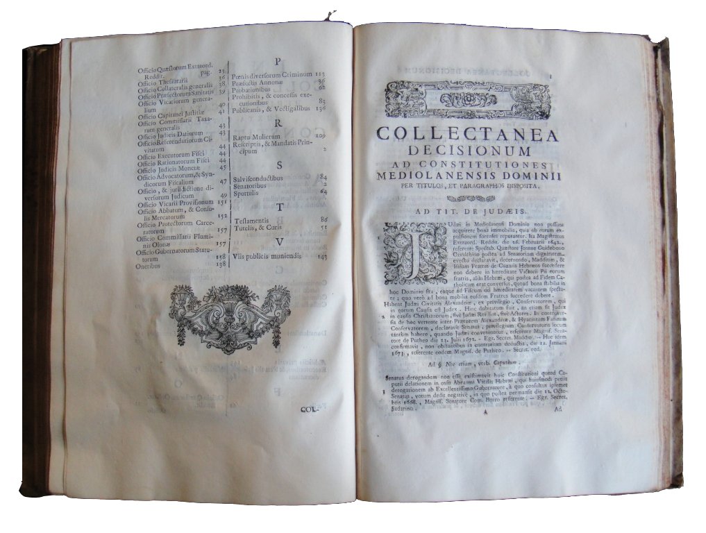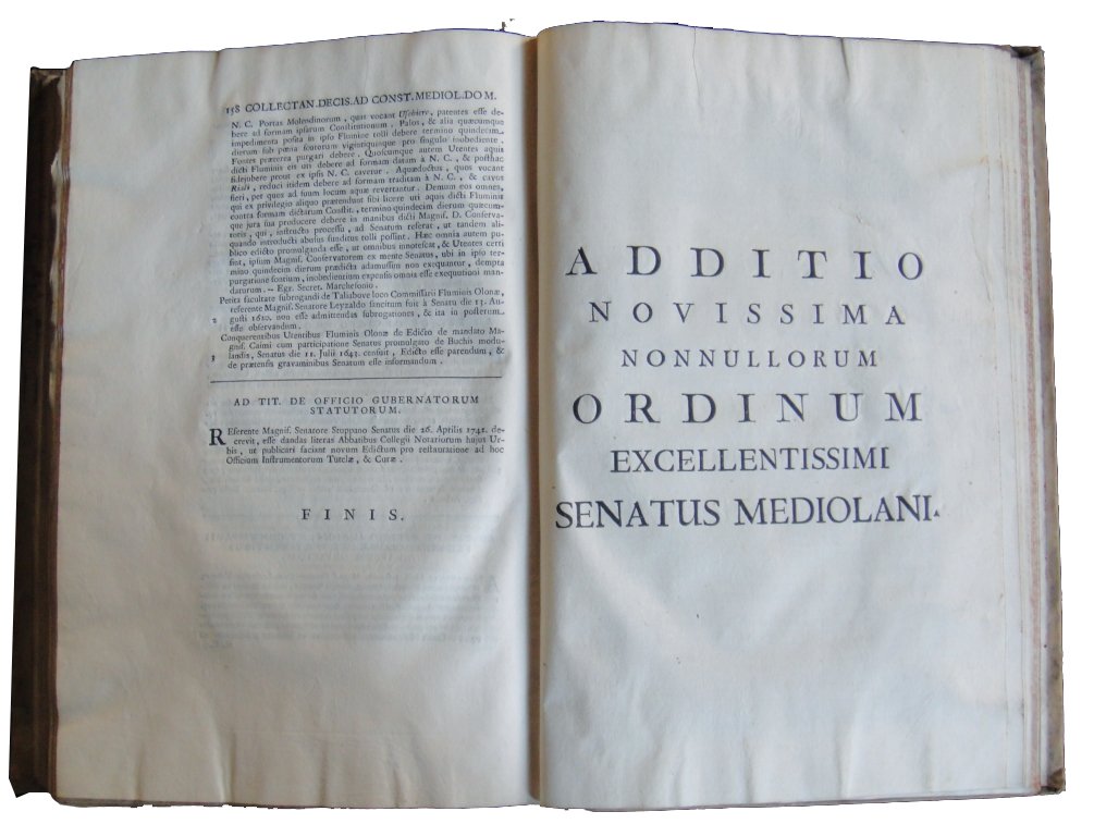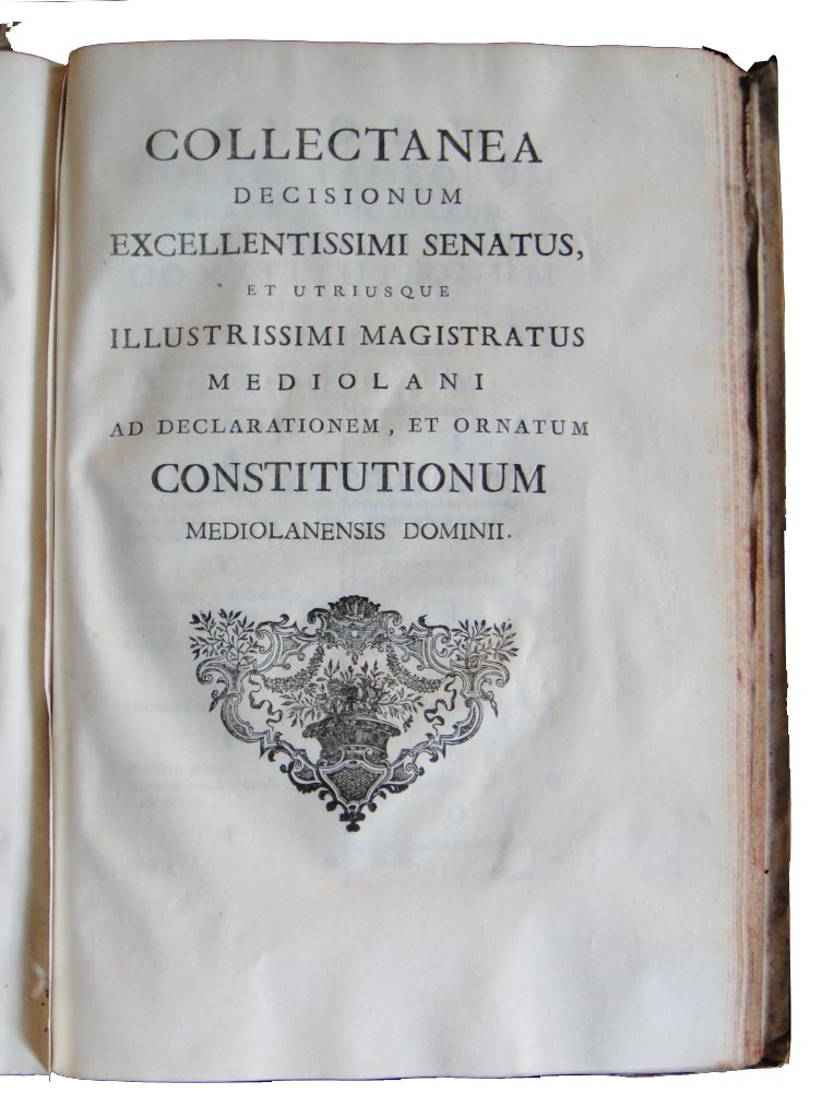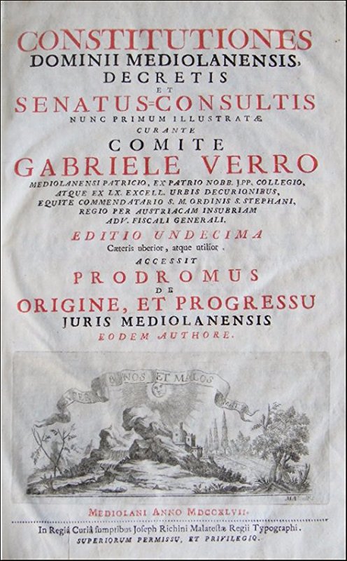 Verri, Gabriele.Constitutiones dominii Mediolanensis, decretis et senatus-consultis nunc primum illustratae curante comite Gabriele Verro ... Editio undecima caeteris uberior, atque utilior, accessit prodromus de origine, et progressu juris Mediolanensis eodem authoreMediolani (Milan), In Regiâ Curiâ sumptibus Joseph Richini Malatestae Regii Typographi, 1747.