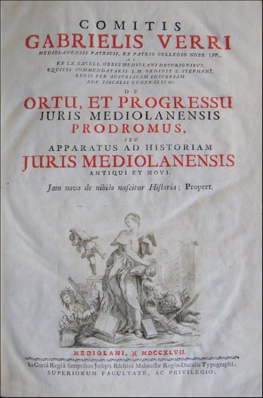 Verri, Gabriele.De ortu et progressu juris Mediolanensis antiqui et novi. Mediolani (Milan), In Regiâ Curiâ sumptibus Joseph Richini Malatestae Regii Typographi, 1747.Small folio, contemporary stiff vellum with ochre label and gilt-lettered title at spine, pp. [16], clxvii, [21], 202, [4], 208, [68].