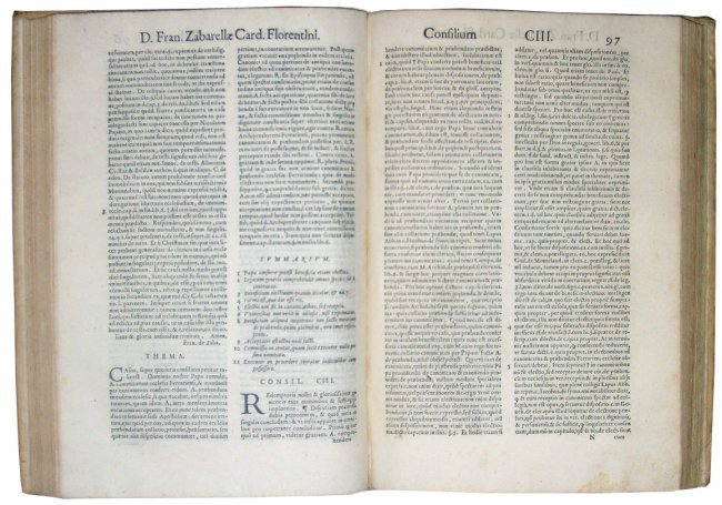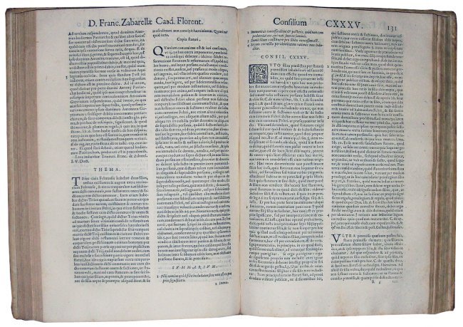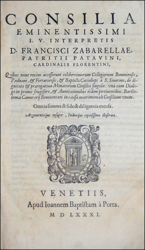 ZABARELLA, FRANCESCO. Consilia eminentissimi I.V. interprete D. Francisci Zabarellae, patritii Patauini, cardinalis Florentini, quibus nunc recens accesserunt celeberrimorum Collegiorum Bononiensis, Paduani, & Ferrariensis, & Baptistae Cacialupi a S. Seuerino, de dignitate & praerogatiua monacorum consilia singula: ... Bartholomaei Camerarii Beneuentani in causa matrimoniali consilium vnum. Omnia summa & fide & diligentia excusa. Argumentisque insuper, indiceque copiosissimo illustrata. Venetiis, apud Ioannem Baptistam a Porta, 1581.
