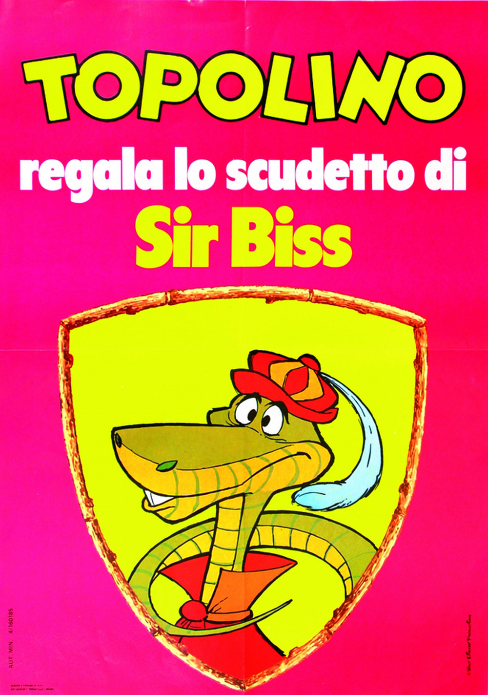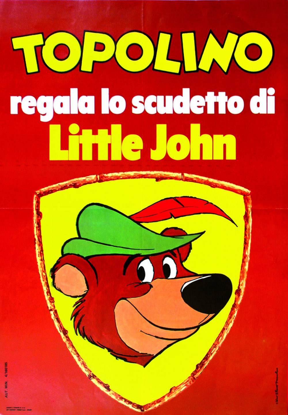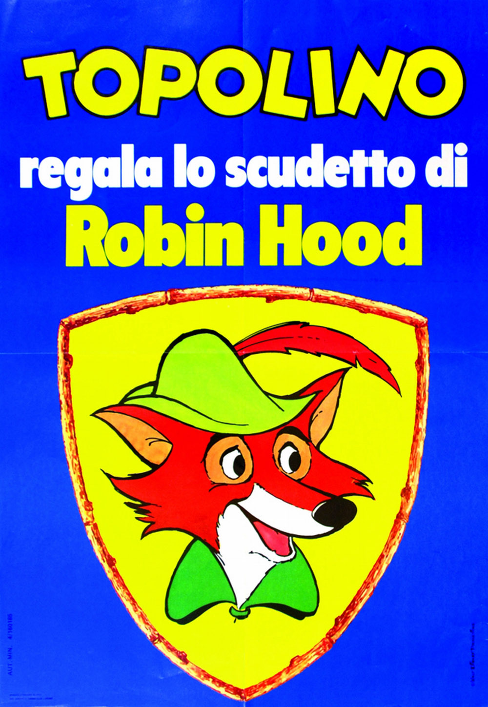 collezione di 5 manifesti promozionali ciascuno cm 42x60: Principe Giovanni allegato Topolino 1011; Fra’ Tac allegato Topolino 1012; Robin Hood allegato al 1013; Little John allegato al 1014 e Sir Biss allegato al 1015. Piegatura centrale, in eccellente stato.