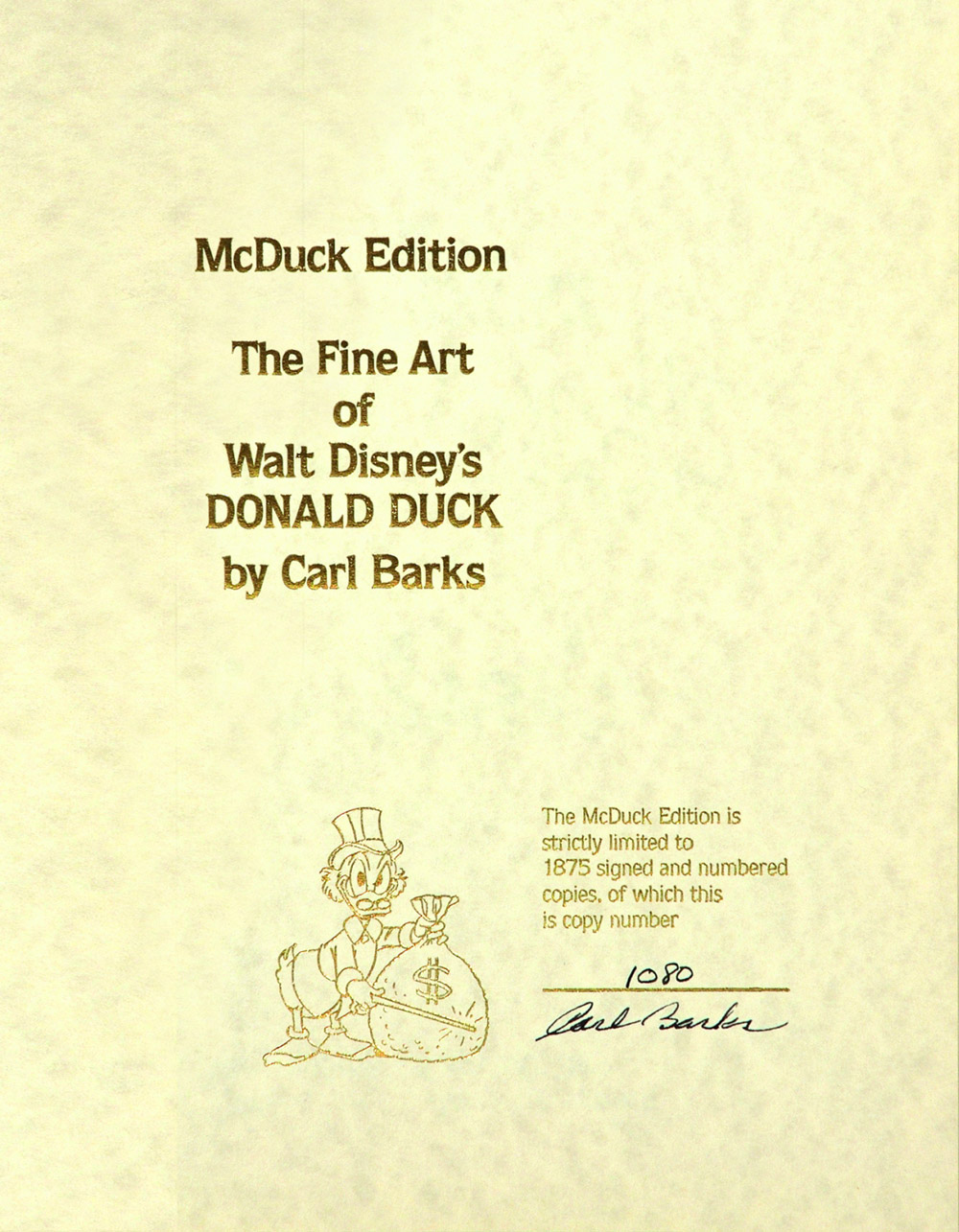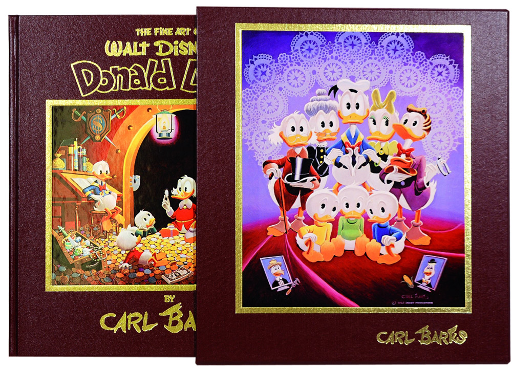 Russ Cochran and Bruce Hamilton Publishing, Usa 1981. Edizione a tiratura limitata a 1875 esemplari, numerati e firmati da Carl Barks (ns. n° 1080). Cm 27,5x31,3, pp. 312. Figurato a colori. L’opera, vanta introduzioni di B. Boatner e di B. Hamilton, presenta in ordine cronologico i 108 dipinti di Barks riprodotti fedelmente su carta di pregio, con numerose tavole apribili a doppia pagina utilizzate per i dipinti in formato orizzontale. Il Santo Graal dei volumi Disney americani, la nostra copia, in versione burgundy, è eccellente, conservata nel cofanetto editoriale figurato.