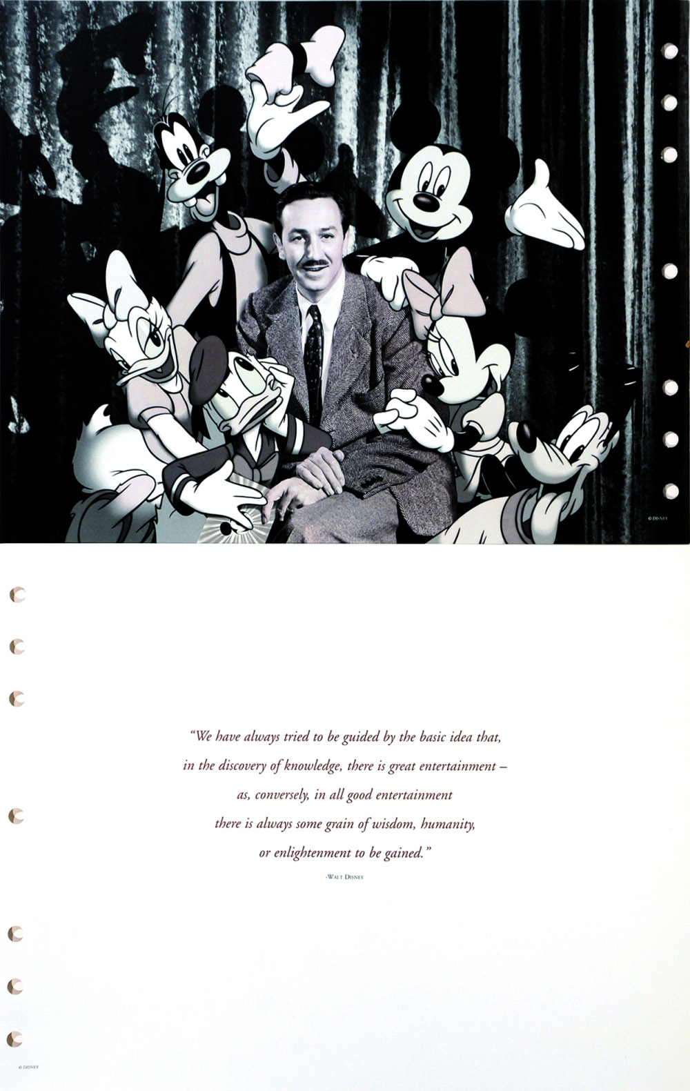 Disney Publishing, 1997. Con una prefazione di Roy Disney. Obl. Cm 44x30, pp. 312 illustrate b/n e colori; rilegatura ad anelli. Guida fuori commercio riservata ai licenziatari Disney nel mondo; racconta con ricchezza di illustrazioni la storia del merchandising Disney e dei vari tipi di utilizzazione, arrivando alle edizioni a fumetti nel mondo con particolare attenzione all'Italia. Presenta quindi i principali personaggi: Topolino, Minnie, Paperino, Paperina, Pippo e Pluto, introducendoli con una filmografia e numerosi model sheets per descriverne espressioni e abbigliamento. Eccellente stato, completo delle carte aggiuntive, ospitato in cofanetto cartonato, quest'ultimo con una piccola lacerazione.