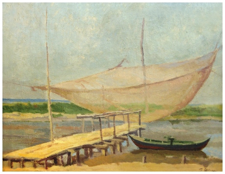 GIULIO ALLORI Livorno 1894 – Livorno 1966 Rete al Calambrone Olio su tela 46 x 61. Firma in b. a d.; sul verso etichetta dell’artista. B.A.: 100