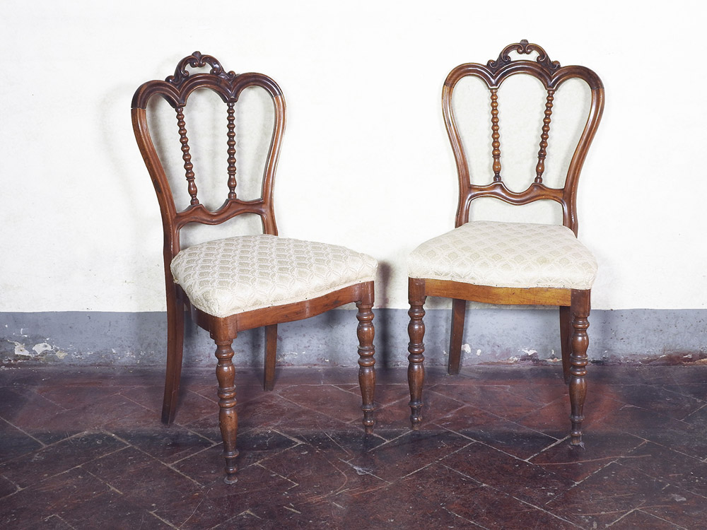 Serie di quattro sedie in noce metà del XIX secolo schienali tripartiti, gambe anteriori tornite