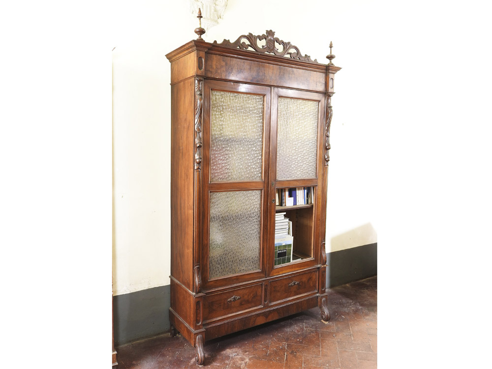 Libreria impiallacciata in noce e radica di noce seconda metà del XIX secolo cimasa traforata con volute e girali, finali a pinnacolo, fronte dritto a due sportelli a vetro smerigliato con motivi loreali, lesene laterali intagliate con volute e frutti, due mezzi cassetti sottostanti, piedi a ricciolo, difetti h cm 245x155x50